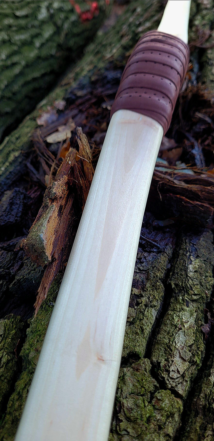 Roter Hartriegel im letzten Januar abgesägt. Am unteren Ende hatte er 8cm Durchmesser mit Rinde. Mit Knick gewachsen. Daraus resultiert der leicht zurückgesetzte Griff. Viel Reflex hatte er aber nicht. 154cm Länge NzN. Unten etwa 2cm kürzer als oben. Mehr Länge war leider für keinen der Wurfarme mögl ...