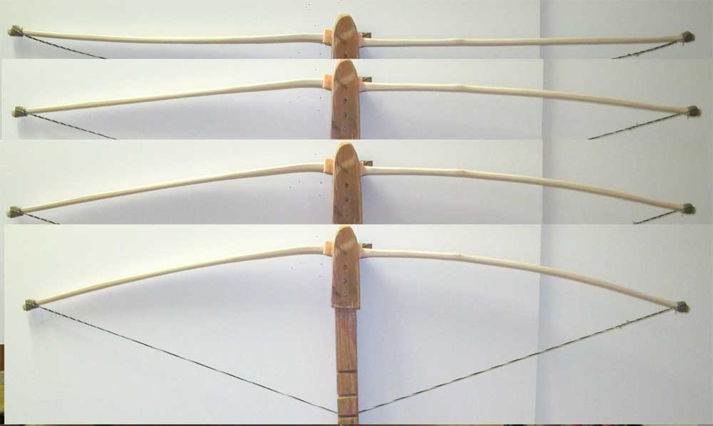 Zur Doku, zwecks der Erinnerung für den Fall dass es knackst. Der Bogen liegt jetzt anders herum im Tillerstock, dann ist der Knick im jetzt rechten Wurfarm nicht so deutlich. Das nächste mal dann mit kurzer Sehne.