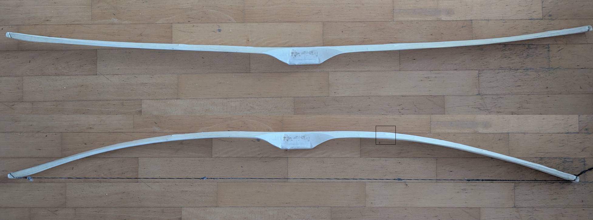 Homunculus ?? Neee, kein kleiner Mensch, es soll ein Bogen werden, gem. Anleitung Victor F. :D Überstände des heute Vormittag geklebten Stücks am unteren WA-Ende wurden entfernt, die Rückenseite nochmal geschliffen und das erste Hasellaminat aufgeklebt. WA-Ende unten Klebung geschliffen.JPG Rücke ...
