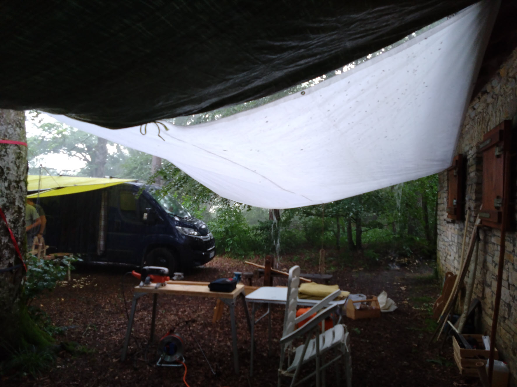 War gestern im Baumarkt und habe bei der Gelegenheit noch eine 4x6m Plane gekauft. Ich bringe auch noch ein paar Meter Spannschnüre und starke Häringe mit.