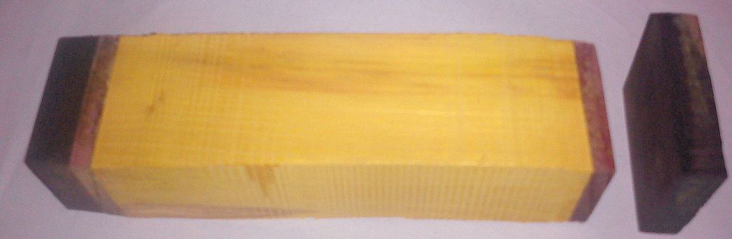 Auch ich habe ausgepackt und zum Vorschein kam, wie vermutet eine Holzkantel für einen Messergriff. Jedoch war sie zusätzlich noch an den Stirnseiten, mit je einer Holzscheibe aus Purple Heart und Grenadil(1x) verleimt!!! Eine wirklich schöne Kombination! Schwarz-rot-gold-rot-schwarz. ;D Eine Ho ...