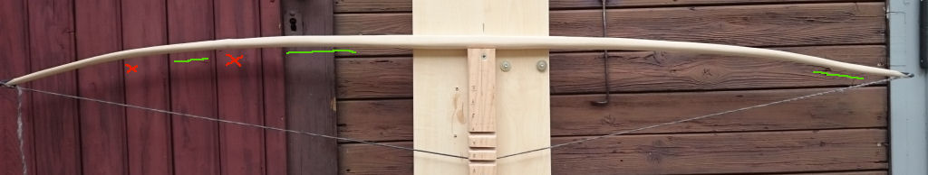 Also der Griff ist 11cm lang und ist aufgeteilt in 7cm unten und 4cm oben außerhalb der geometrischen Mitte, wo sollte ich ihn jetzt auflegen? Auf der Mitte des Bogens...irgendwie steh ich grad auf der Leitung :o . Ich hab auch mal ein paar Fotos vom ersten vorsichtigem Tiller gemacht, sieht nach viel Arbeit aus. Rot heißt Finger weg, grün bedeutet wegnehmen. Berichtigt mich bitte wenn ich falsch liege, da ja schon im Vorfeld ein gewisser Deflex am linken Wurfarm ist.