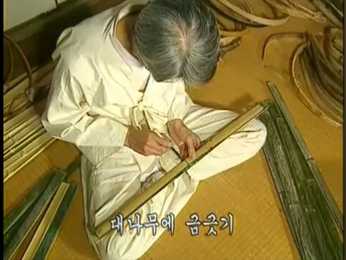 Hier ist zu erkennen dass der Spleiß keine geraden Linien hat, sondern leicht gebogene. Die Form des Spleißes wird dann vom Siyah direkt auf den Bambus übertragen und ausgesägt. Hier fällt auf dass der Schnitt mit der Säge ein ganzes Stück weiter in den Wurfarm fortgesetzt wird. Dies bewirkt dass sich der Spleiß vom Bambus beim zusammenfügen mit dem Siyah etwas auseinander drücken lässt. Dadurch halten die Teile beim verkleben besser zusammen. Der Spleiß wird dann mit Schwimmblasenleim geklebt (sowie alle weiteren Klebungen auch) und mit Schnur umwickelt. Nun wird der Bambus im bereich des Griffs Rückenseitig ausgedünnt. Die Bauchseite des Rahmens wird nun Verzahnt , sowie die ausgedünnte Stelle für die Griffschale Rückenseitig und die Griffschale selbst. Hier fällt nur indirekt auf, dass der runde Bogenbauch vom Bambus flachgefeilt wurde. Nun werden 2 Hornstreifen (einer je Wurfarm) ebenfalls mit Schwimmblasenleim mit dem Rahmen verklebt. Dafür wird innenliegend eine Holzform für die Formgebung und zum verhindern von Verdrehungen beigelegt. Im Video ist zu sehen dass auch über das Horn etwas beigelegt wird. Dann wird alles Stramm mit einem Seil umwickelt. Im Video wird das Werkzeug dafür als "Lever" also Hebel übersetzt. Wenn jemand den Fachbegriff dafür weis, immer her damit