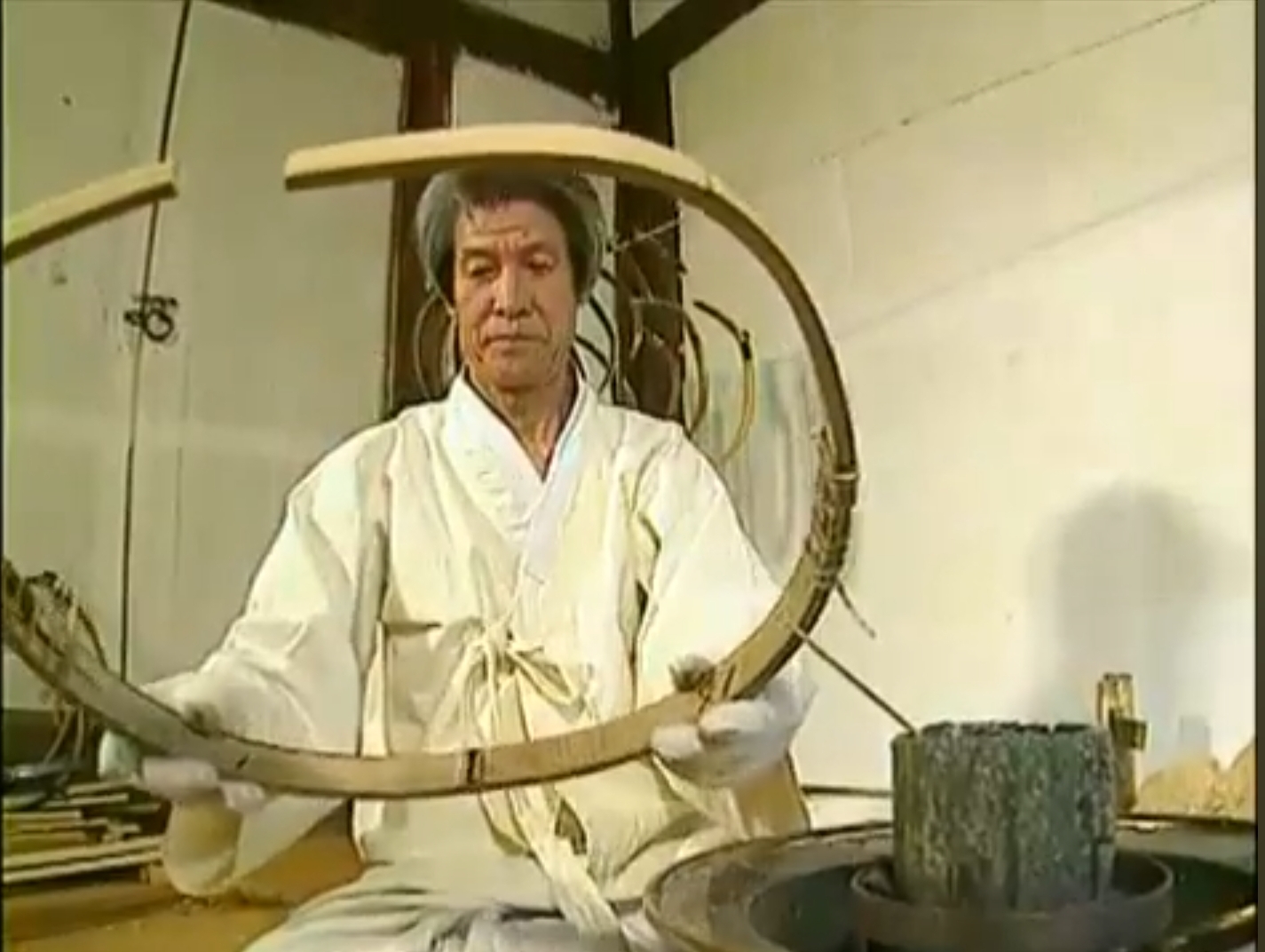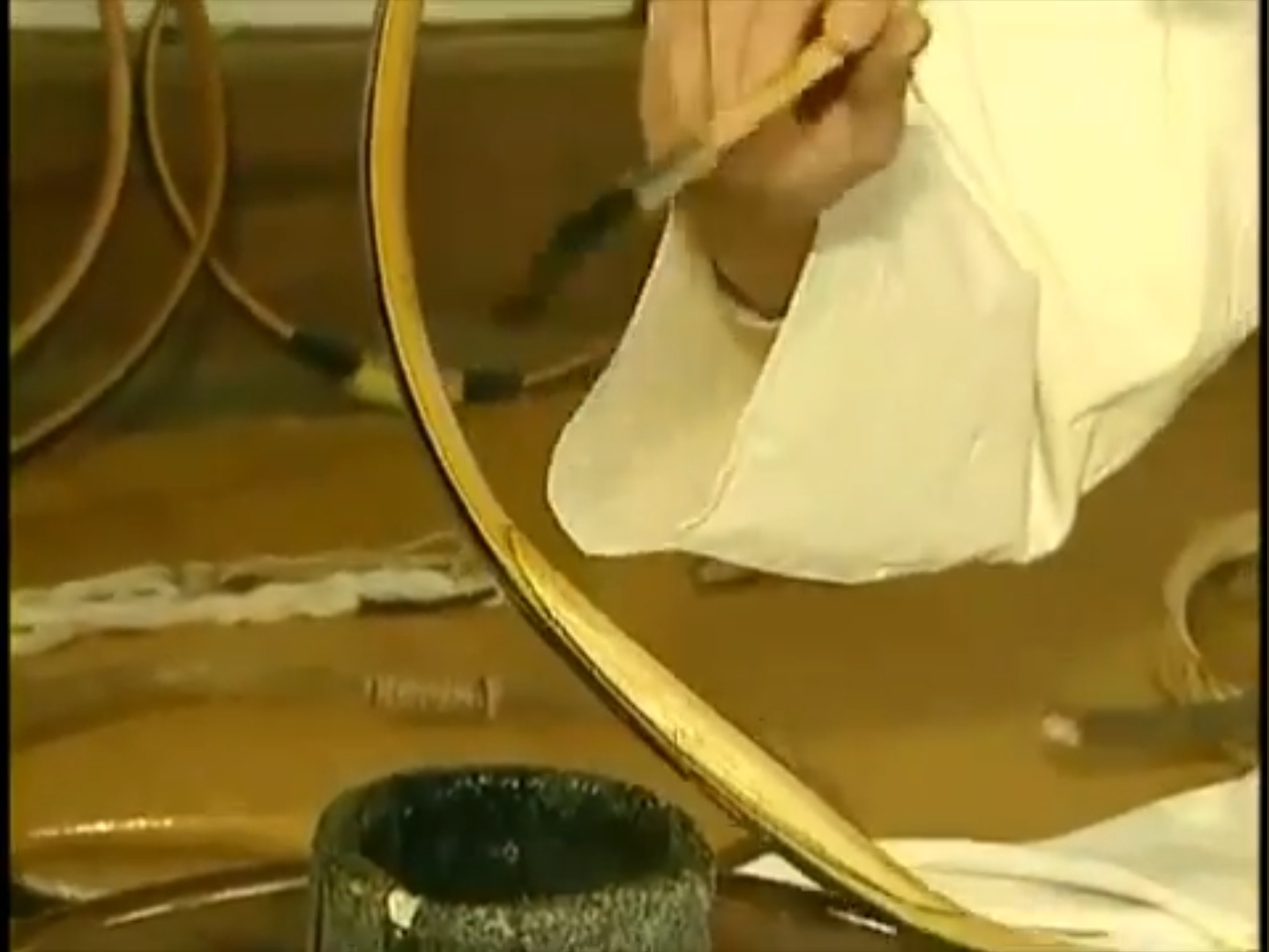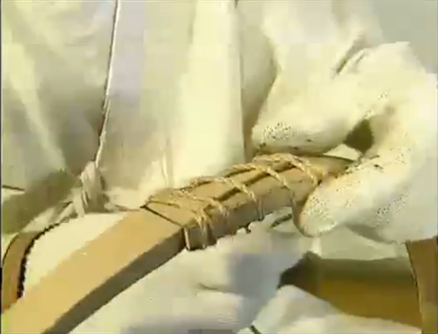 Der Rücken wird nun fertig ausgeformt. Im Video schlecht zu erkennen ist der genaue dickenverlauf und die Formgebung im Bereich des Siyahs. Hier wurde eigentlich der ganze Rücken Ellipsenförmig ausgearbeitet. Nur der Bereich des Siyahs nach dem stark reflexen Knick ist noch in Rohzustand. Danach werden die Enden mit Hilfe eines Holzplättchens zusammengebunden. Anschließend wird der Rücken mit Schwimmblasenleim grundiert. Besonders interessant finde ich es, wie die Sehnen für den Belag vorbereitet werden.