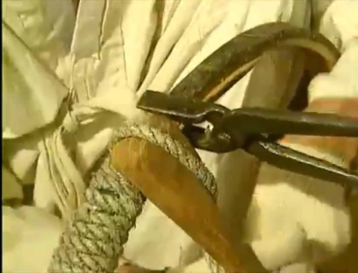 Dann kommt der Moment, bei dem den meisten Bogenbauern, beim schauen des Videos kurz das Herz aussetzen dürfte. Der Bogen wird, mit dem Fuß am Griff und den Händen an den Wurfarmenden abrupt in den Vollauszug gebracht. Ob dies wirklich so gemacht wurde, oder nur durch den Videoschnitt so rüber kommt, weis ich nicht.
