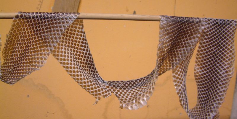 Danach muss man das Natternhemd wieder abrollen und hängt es wie eine Bandnudel über einen Stab zum Trocknen. Dies dauert nur wenige Minuten.