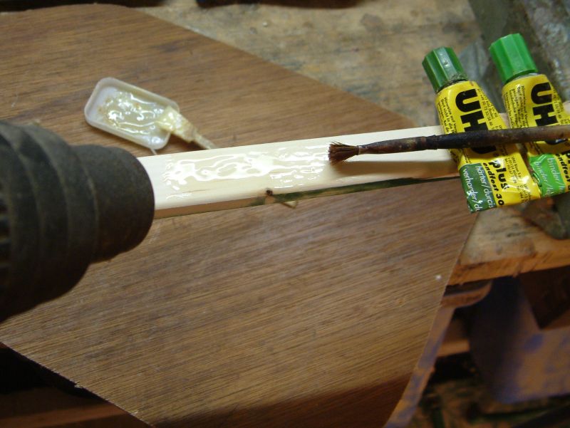 Der Bogenrücken wird schön plan geschliffen. Am besten leicht ballig mit abgerundeten Kanten (s.u.). Ein Zweikomponenten-Epoxy-Kleber (UHU Endfest) wird aufgetragen, mit der Heißluftpistole oder einem Haarfön erwärmt und - so verflüssigt - dann mit einem Pinsel schön verstrichen. Man arbeitet vom Griff Richtung Tipps. Es wird das breite Ende der Haut am Griff angesetzt, sodass der schmalere Schwanzteil am Tipp endet.