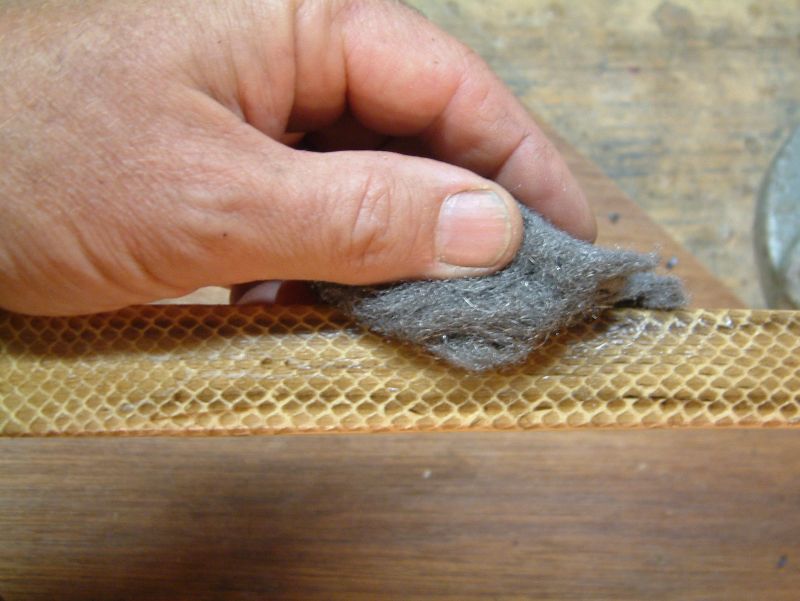 Danach wird die Haut aufgerauht für die Lackierung. Diese ist zwingend notwändig. Man muss sich das so vorstellen: Auf dem Holz wird die dünne Hornhaut mit dem Kleber fixiert, auf der Oberseite ist sie noch ungeschützt und kann u.U. leicht abgerubbelt werden. Ich rauhe immer mit Stahlwolle auf. Wenn sich hierbei die Schuppen lösen, haben wir nicht immer ein Problem. Es gibt Schlangenhäute, bei denen halten die Schuppen, bei den Natternhemden ist es ähnlich, z.B. bei der Vierstreifennatter halten sie, bei der Peitschennatter nicht. Werden nun die Schuppen runtergerubbelt, so hat man immerhin noch eine Schlangenhaut-Struktur, die auch ganz gut aussehen kann (Bild kommt später).