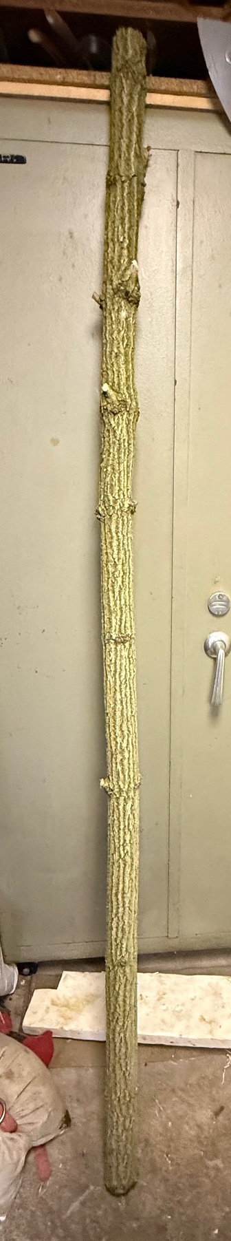 Es ist ein Seitenast von einem Holunder, unten um die 7, oben um die 5 cm und jetzt noch 210cm lang und natürlich nicht so gerade wie er am Baum aussah. Es sieht im Moment nach wenig Drehwuchs aus, aber unten sind die inneren Jahresringe etwas dunkler.