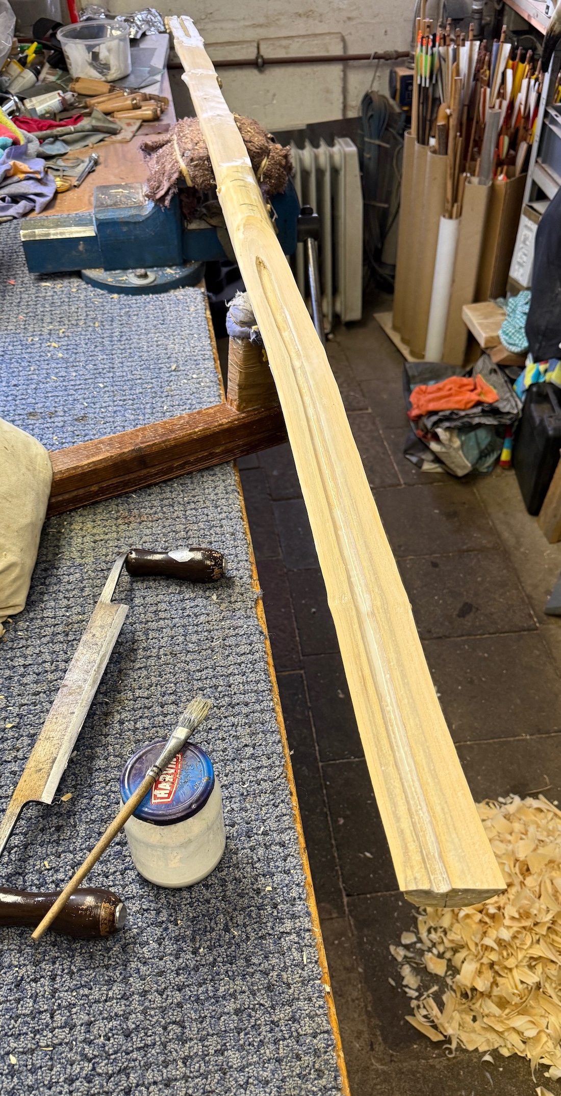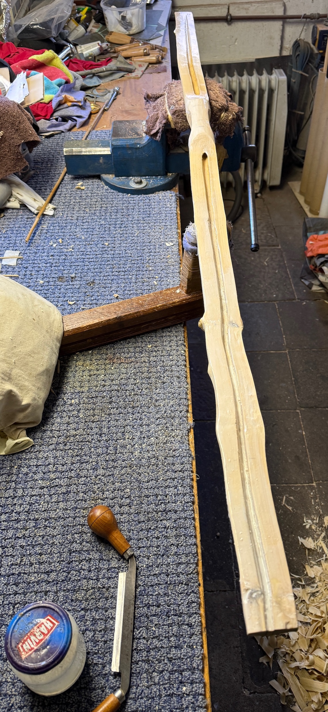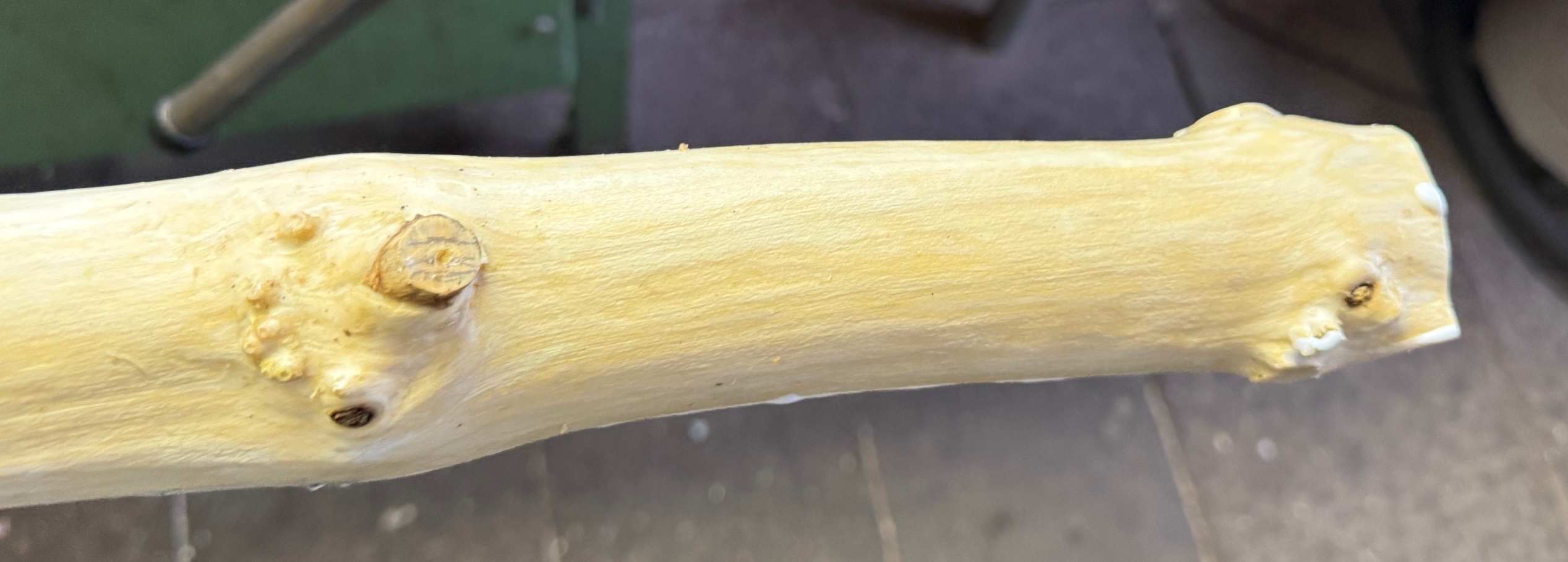 Heute morgen habe ich den Griff grob vorgearbeitet und den kompletten Markkanal freigelegt und alles wieder mit Holzleim versiegelt. Der Kanal durch den Griff ist jetzt offen. Jetzt trocknet er weiter bei 12° und 59% Luftfeuchte. Zur Zeit hat er 1800g und es ist noch kein Verdrehen messbar.