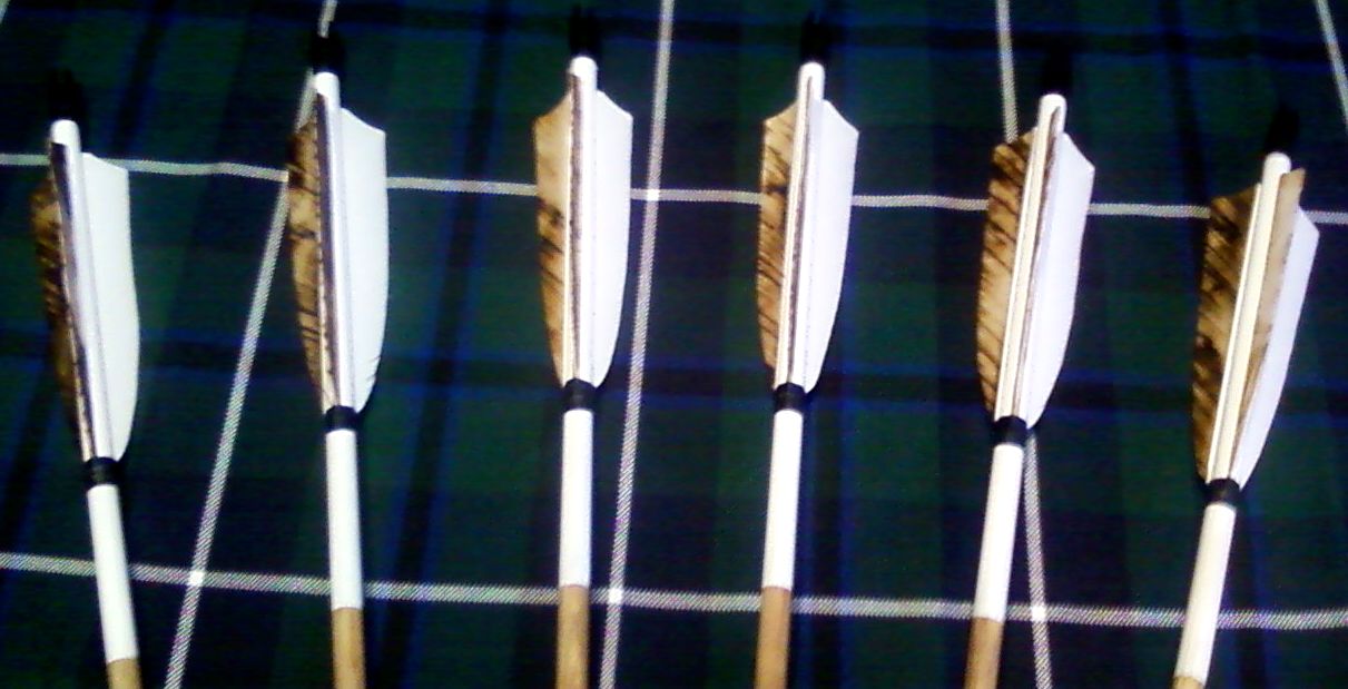 Zur bearbeitung: Zuerst haben die Schäfte 2 Tage in einem Tauchrohr voll mit Leinölfirnis verbracht. Das wurde danach abgerieben und nach dem trocken leicht angeschliffen. Dann kam eine schicht lack (klarlack ,Matt) drauf. Federn wurden mit uhu hart und von hand aufgeklebt danach auch von hand gewickelt. die Nocken wurden ebenfalls mit Uhu hart geklebt. die Spitzen habe ich mit fluessigem blei gefuellt um die pfeile auf ein exaktes gewicht zu bringen. danach wurden sie mit heißkleber am schaft befestigt.