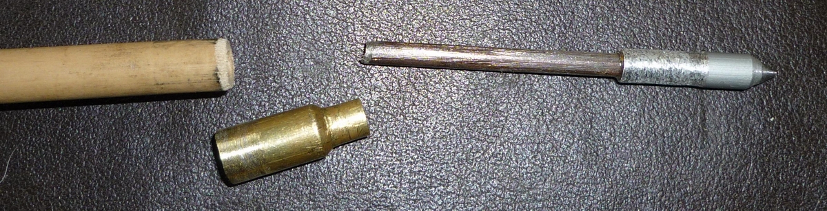 Das "Projektil" besteht aus einem Stahlkern, der auch den Dorn bildet, um den passene Aluröhrchen geklebt und geschliffen wurden. Statt von einer Wicklung wird der Schaft von einer Patronenhülse Kaliber .308 Win stabilisiert. Diese Spitze wiegt 190 Grain bei einem Schaftdurchmesser von elf Millimetern.