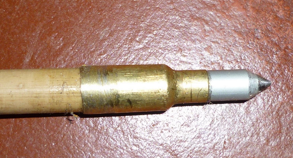 Hier nochmal dasselbe ein bißchen kleiner: Die Hülsen der .223 Rem entsprechen ziemlich genau dem Schaftdurchmesser 11/32 Zoll, was diese Konstruktionsweise auch für normale Pfeile interessant machen dürfte. Diese Spitze wiegt 140 grs. Der Dorn ist hier sehr lang, man könnte die Spitze auch noch leichter bauen.