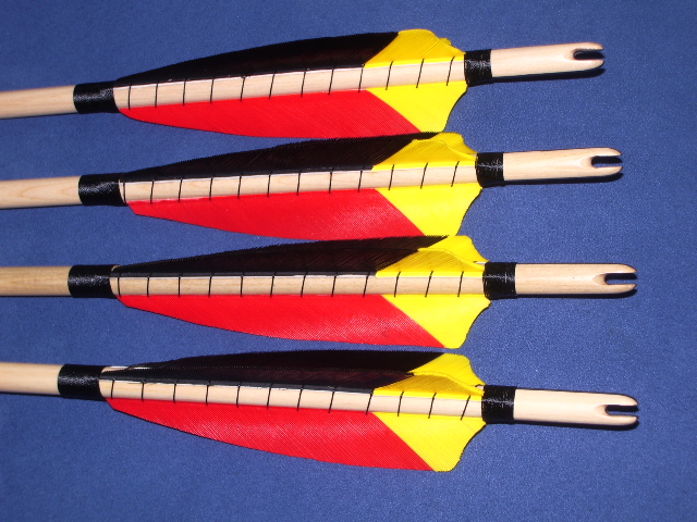 Ich find die Pfeile eigentlich gut gelungen, bis auf die mit der Außenfahne. Die hättest vielleicht auch noch ein bisschen in Form schneiden sollen. Es kommt nicht häufig vor, dass man für Turnierpfeile Graugansfedern verwendet. Find ich aber klasse und die geben sicherlich einen Blickfang ab. Die Wicklung vorne find ich aber vllt. etwas zu grob. Da hätte ich lieber dünnen Nähfaden verwendet. Die Nocke hinten hätte ich auch noch durch eine Wicklung gesichert.