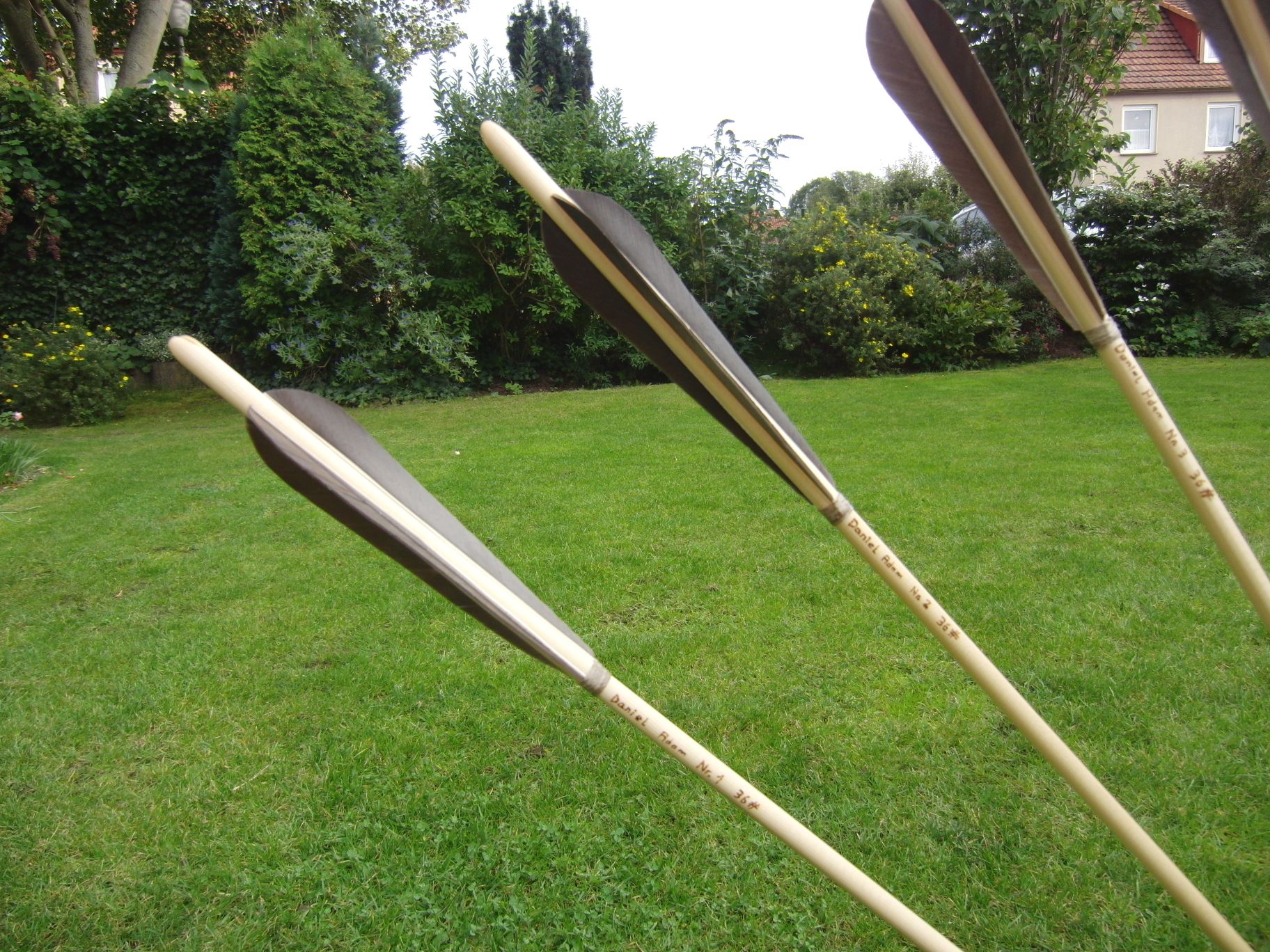 Die Pfeile sind alle 29" lang und mit Graugansfedern befiedert (scheiß Arbeit aus 40 Federn dann die Befeiderung rauszuschneiden und zu schleifen... ach naja aber es hat doch einigermaßen Spaß gemacht