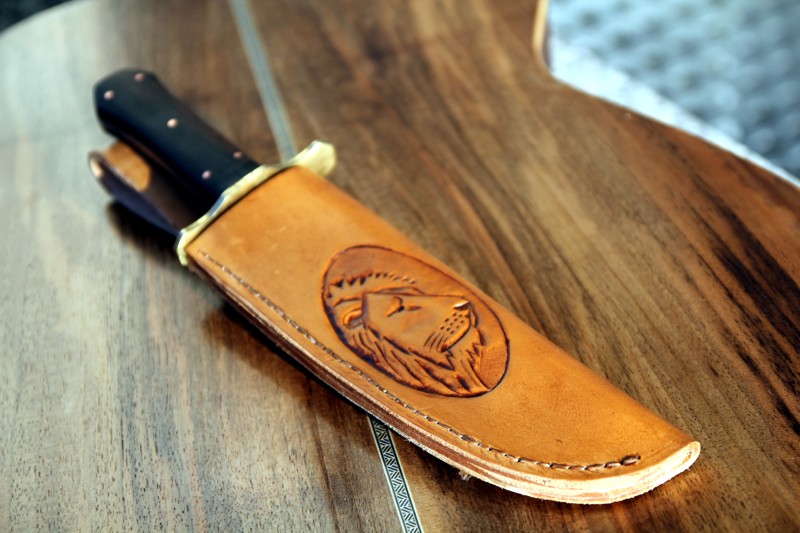 Klinge von Knifesupply, Griff Ebenholz im Coffin-Style wie um 1870 en vogue, vernietet mit Kupfer, zusätzlich mit Epoxy verklebt. Parierstange, Messing von Hudson's Bay. Scheide aus vegetabilem Rindsleder, Punziertes Löwenmotiv (inspiriert von Aslan -Narnia)