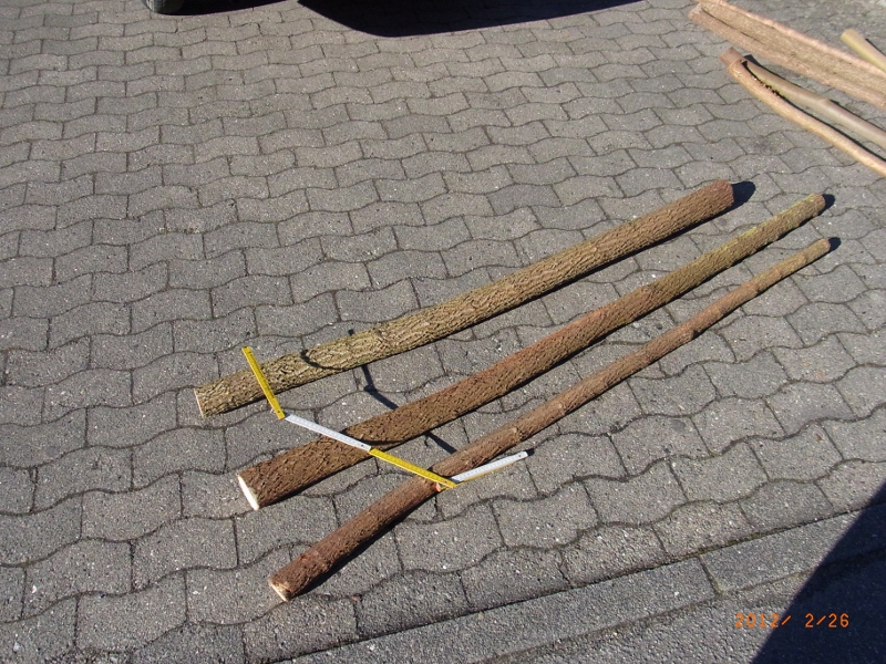 Weiterhin habe ich etliche (best. 10 Stück) Ulmestäbe aus einem Scheiterhaufen rausgezogen. Sie sind nicht besonders dick; die meisten sind nur zwischen 4 und 5 cm. Längen zwischen 170 und 210.
