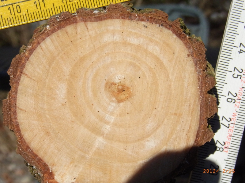 Hier ist mal die Stirnfläche des größten Stabs. Sind solche "Stecken" aus Ulme zu gebrauchen oder zu dünn? gleich gehts weiter...