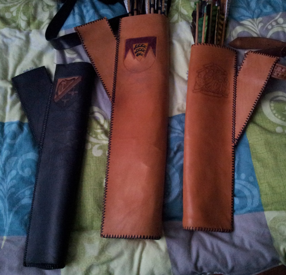 Das sind meine drei selbstgebauten Köcher. Als erstes baute ich den schwarzen Köcher, welcher auch meine erste Punzier-Arbeit war. Das Motiv ist das Wappen der Assasinen-Gilde von Ankh Morpork. Dazu gibt es noch einen Armschutz (2. Punzierarbeit). Beides zusammen waren Teile meiner Gewandung auf der Scheibenwelt-Con 2009.