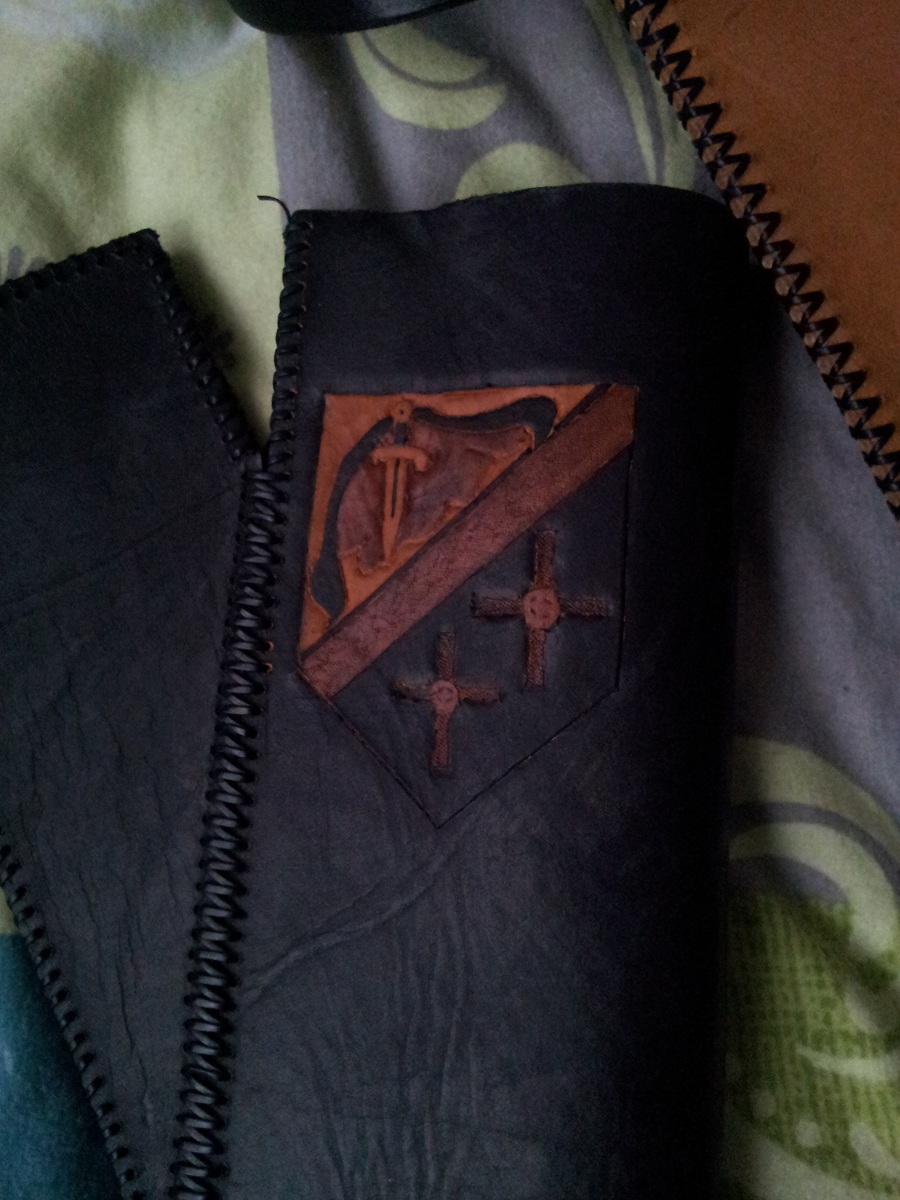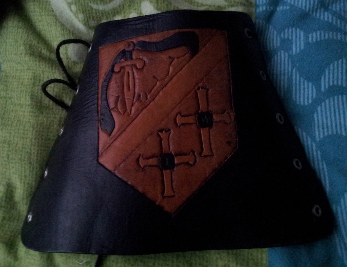 Im gegensatz zu meinen Erstlings-Punzierwerken hatte ich hierbei einen Kollegen aus dem Bogenverein der mir einige Tips gab (z.B. dass man das Leder nicht nur feucht, sondern richtig einweichen muß). Das Motiv ist das Wappen der stolzen und freien Bogenschützen von Ankh-Morpork (Pandabär-Edition... lange geschichte) und ich war bis vor kurzem noch recht stolz darauf.