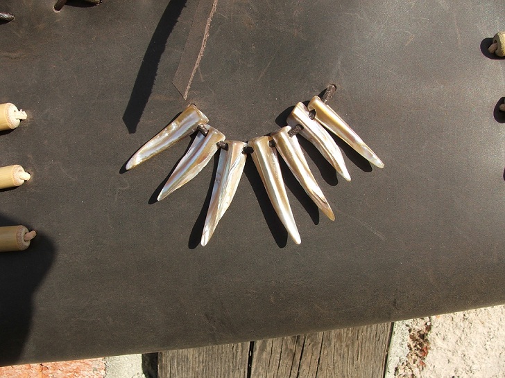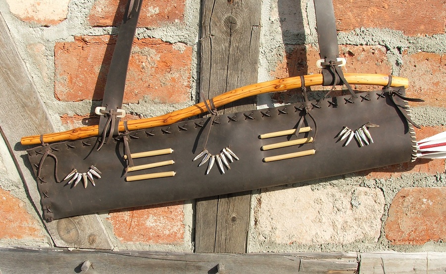Das Leder ist 70 cm lang und 30 cm breit zugeschnitten und dann zusammen genäht. 15 Pfeile passen gut hinein. Die Riemenverbindungen sind aus Kuhhornstreifen.