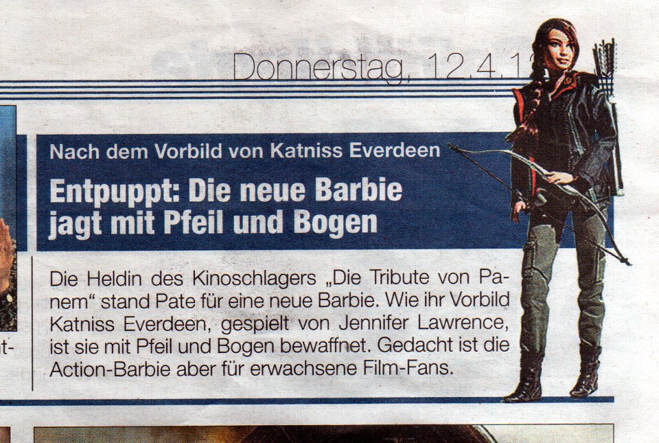 Hunger Games Barbie :D - wird die Bogenjagd dadurch anders gesehen? Jedenfalls schafft "Die Tribute von Panem" ein positives Image. Bitte keine Jagddiskussionen starten! Es geht um die Wahrnehmung von Bogen und Pfeil in der Öffentlichkeit.