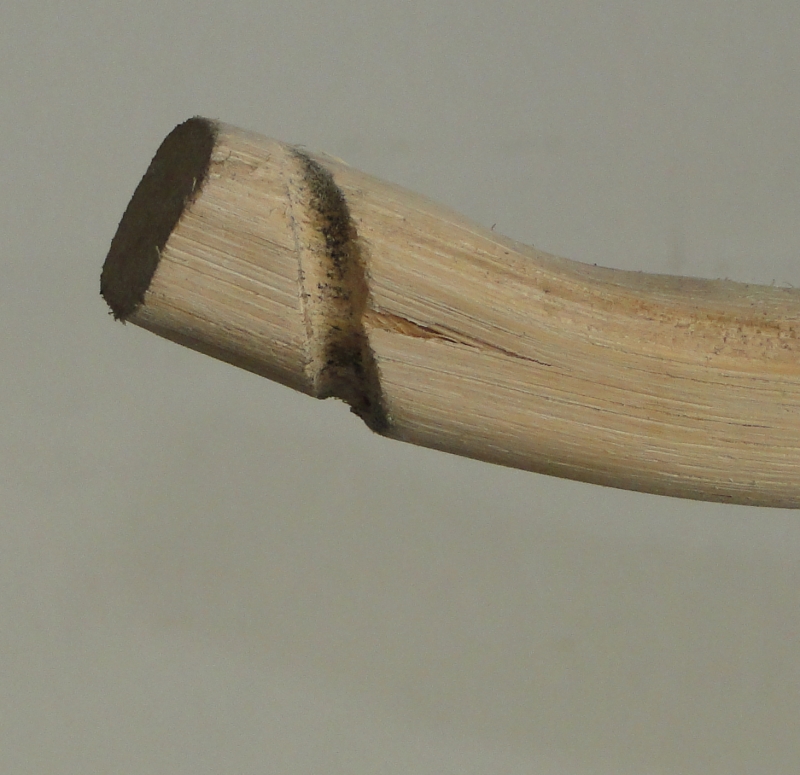 Die Außenseite des Stabes hab ich als Bogenbauch benutzt und den Bogen bisher über den Rücken getillert. Das Querschnittsprofil ähnelt einem umgedrehten „Kastenbrot“