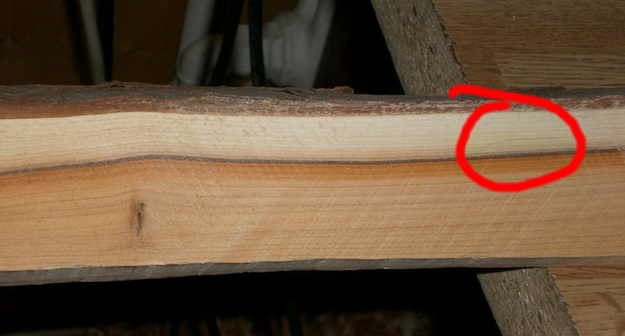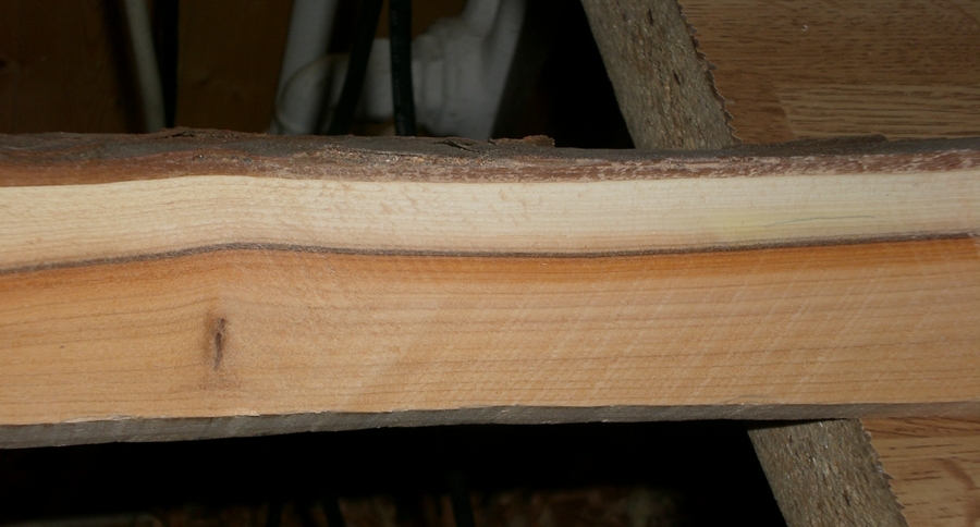 Wie auf dem Bild zusehen ist, erstreckt sich eine dunkle Linie zwischen Splint- und Kernholz, durchgehend von einem Ende zum anderen.