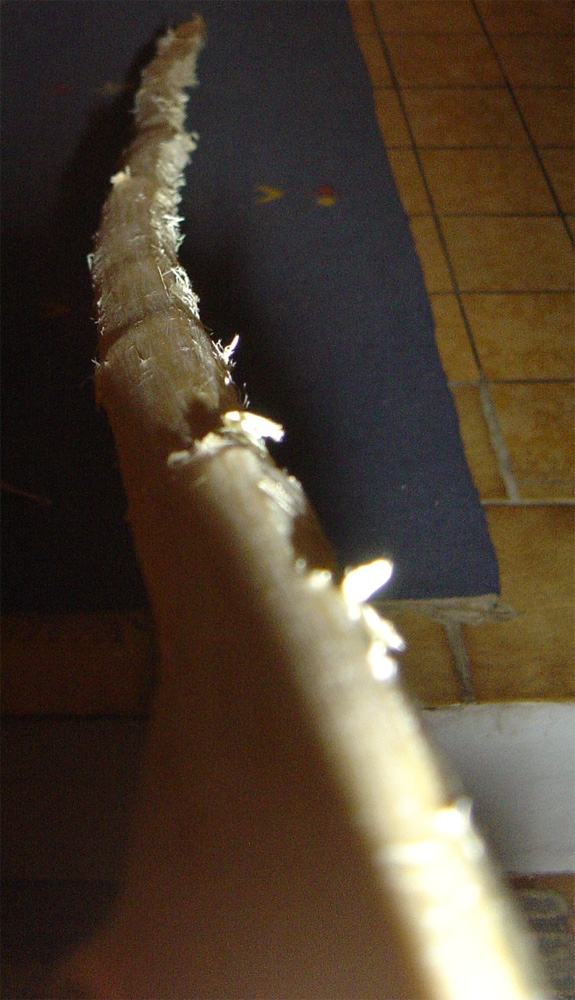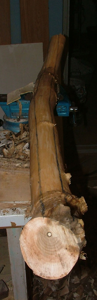 Danach mit dem Zugmesser noch etwas nachbearbeitet damít nicht zuviel Holz trocknen muss. Auch mit die Japansäge ein Entlastungsschnitt durch den Griff gemacht. Dadurch reißt das Holz hier hoffentlich nicht unkontrolliert (beim letzten Sapturnier vom Rabe abgeguckt