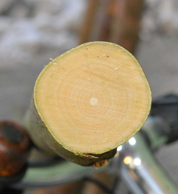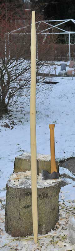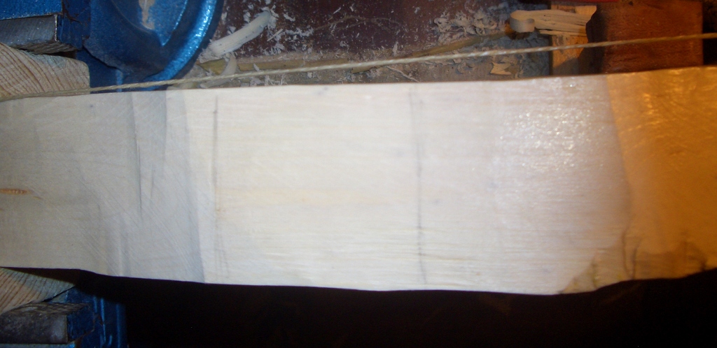 Da ein WA beim Spalten leicht rausgelaufen und daher recht dünn ist, habe ich erst einmal die volle Breite von jetzt 4,5cm auf ca. 3/4 der WAs gelassen, dann erst auf 1,5cm verjüngt. Den Griffbereich habe ich auch erst einmal breit gelassen und die WA ein wenig ausgedünnt. So lege ich das gute Stück zum Trocknen und als Notfall-Reserve zur Seite.