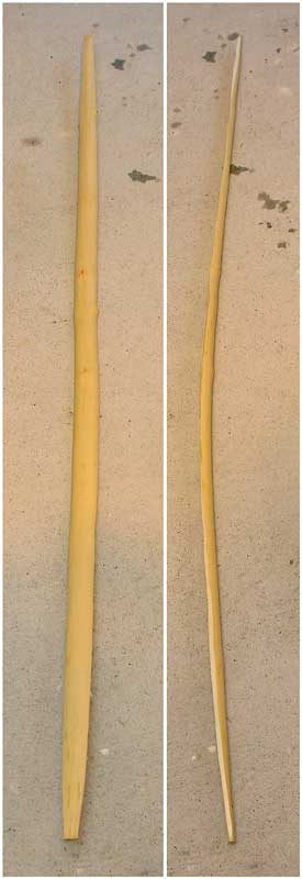 Eigentlich wollte ich ohne Netz arbeiten, sprich nur mit der Eibe, aber als ich gesehen habe, dass es unter der Leimversiegelung der Stirnseiten des Ahorns nach einer Woche anfängt zu gammeln, habe ich den Sapling schnell gespalten und von der Rinde befreit. Außerdem habe ich den ehemals 266cm langen und 5,5cm breiten Sapling auf 172cm gekürzt, um einen möglichst gleichmäßigen Reflex zu bekommen.