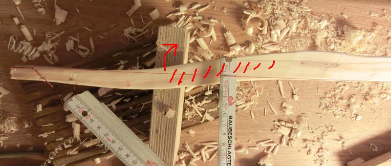 Ihr könnt mich gerne irgendwann quälen, wenn wir uns mal irgendwo treffen, aber ich werde die Verdrehung nicht weiter rausarbeiten und den Bogen damit schwächen. Ich bin so froh, daß aus dem störrischen Biest ein schießfähiger Bogen wird, der mir noch nicht um die Ohren geflogen ist UND der sogar mein erhofftes Zuggewicht hat