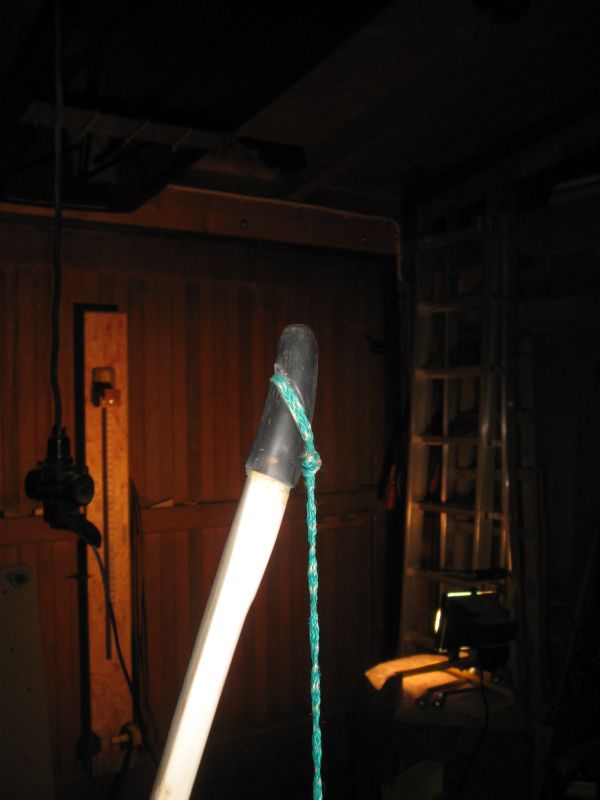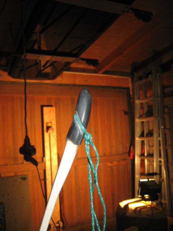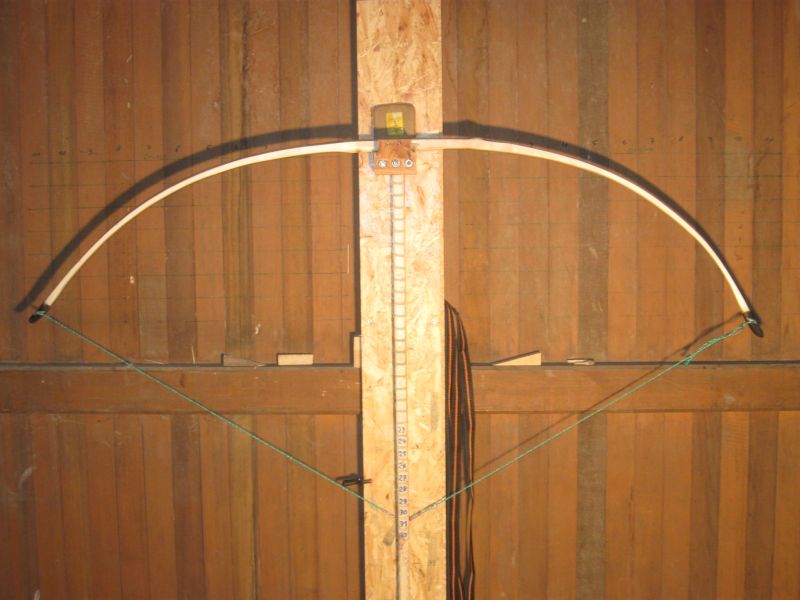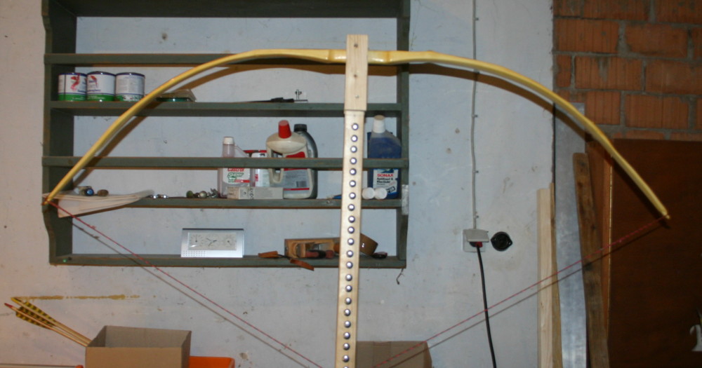 Ich hab den Bogen immer noch nicht auf Standhöhe. Vom Auszug her hab ich ihn eigentlich so weit, aber ich bin nicht stark genug, ihn aufzuspannen. Dafür sind immerhin auch gut 50# nötig. Bisher schaff ich es nur, dass die Sehne straff am Griff anliegt, aber freischwebend ist sie noch nicht. trotzdem sieht man, dass der Bogen trotz nicht vorhandener Standhöhe an den Enden noch zu steif ist.