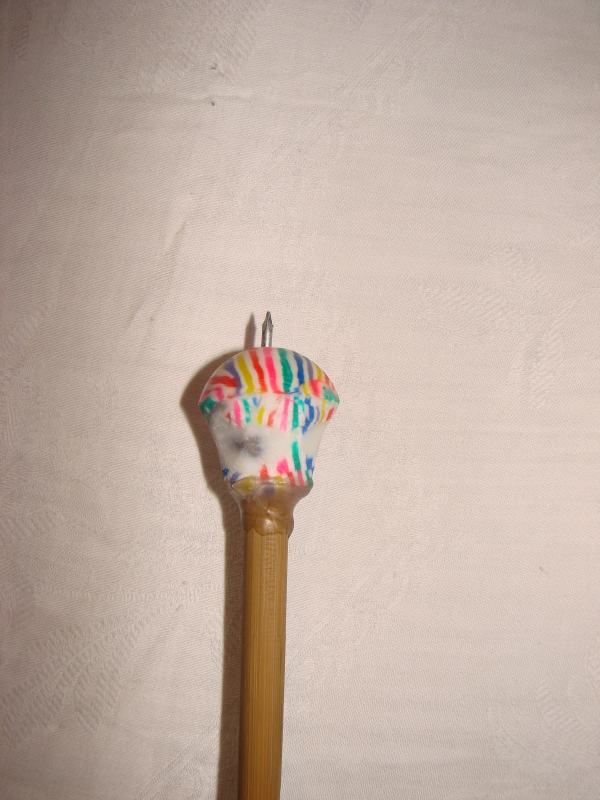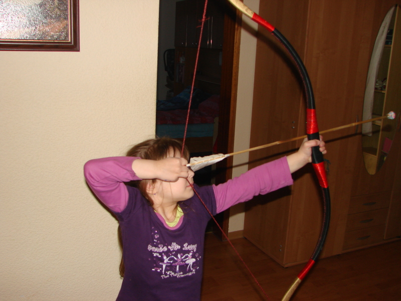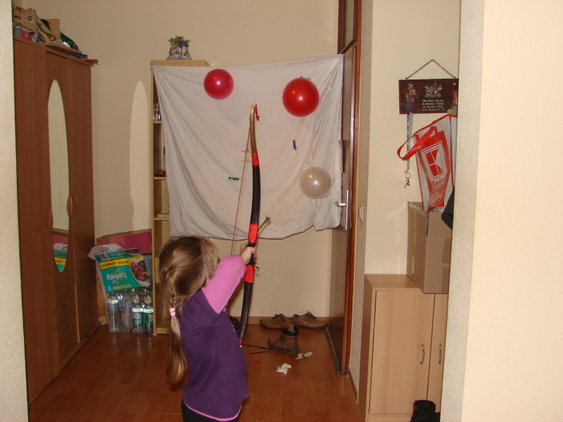 Hier will ich zeigen, wie man Spaß trotz schlechter Wetter mit dem Bogen haben kann. Ich habe für meine Tochter Flummipfeil gebaut(so habe ich diese Pfeil genannt) Kinderpfeil aus Bambus 20,5 Gramm, als Spitze abgeschnittener Flummiball mit Nagel in der Mitte zum Luftballon platzen. Da der Bogen bis 26" ziehen lässt habe ich auch natürlich Spaß gehabt, mein Flur ist zum Glück 10m lang.