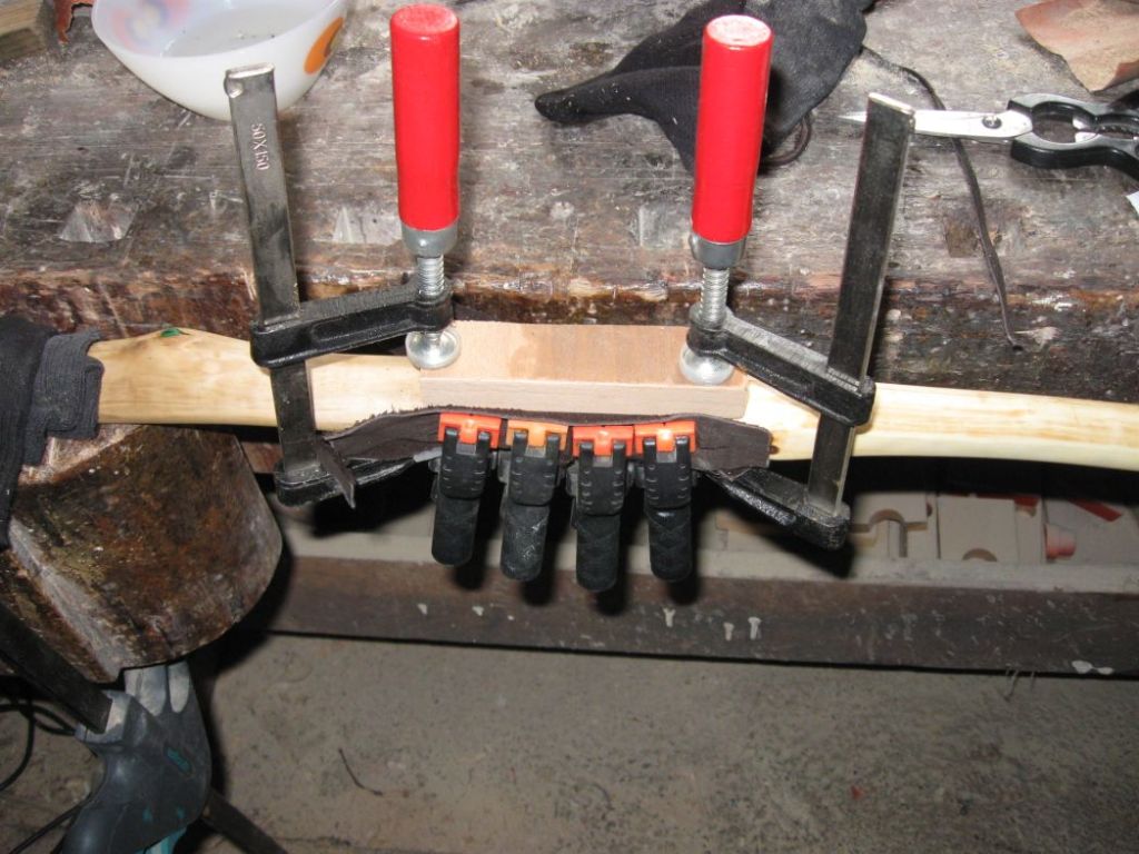 Das Lederstück habe ich 15min ins Wasser gelegt ausgewrungen und und dann zur Hälfte mit Leim eingeschmiert dann direkt auf den Bogen und schöön laang aufgepresst ein Stück Leder je rechts und links, damit sich die Leimzwingen nicht in meinem Griffleder abdrücken dann die Oberseite geleimt und mit Band geflochten und Stück für Stück festgedrückt.