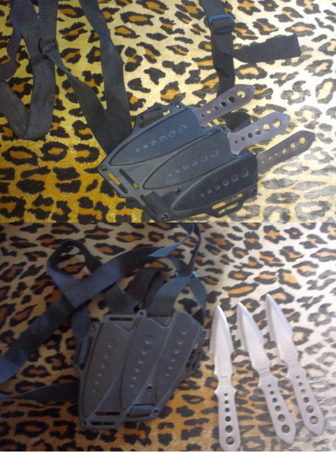 22.31: Bowa : Ein Satz United Wurfmesser mit Schulterholster. Kann man auch ans Bein binden oder Gürtel . Güssenjäger