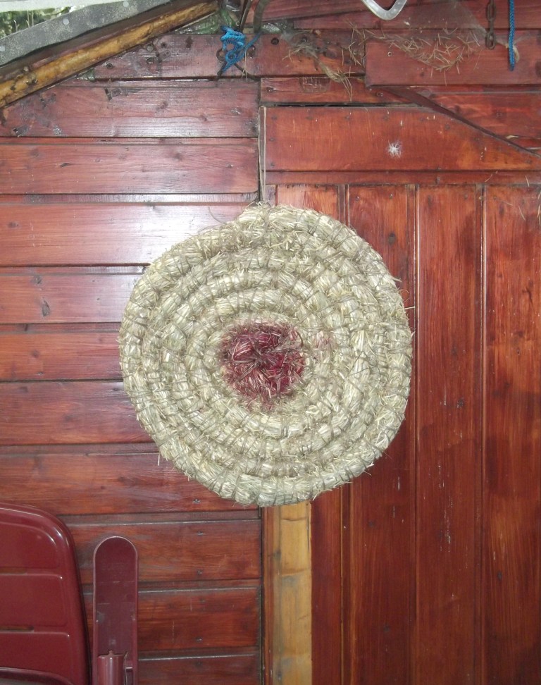 Tja, und damit ist die selbstgemachte Stroh- bzw. Heuzielscheibe eigentlich auch schon fertig... noch einen roten oder schwarzen Punkt in, bzw. über die Mitte gekleckselt und wer es denn möchte, auch noch den äußeren Rand farblich markiert