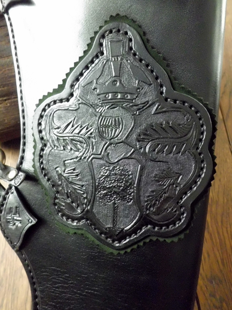 Auf Kundenwunsch wurde ein Familienwappen aus dem 13. Jahrhundert auf dem Köcher platziert, ebenso wurden die Eck- und Randbereiche mit Elementen aus dem Wappen versehen.