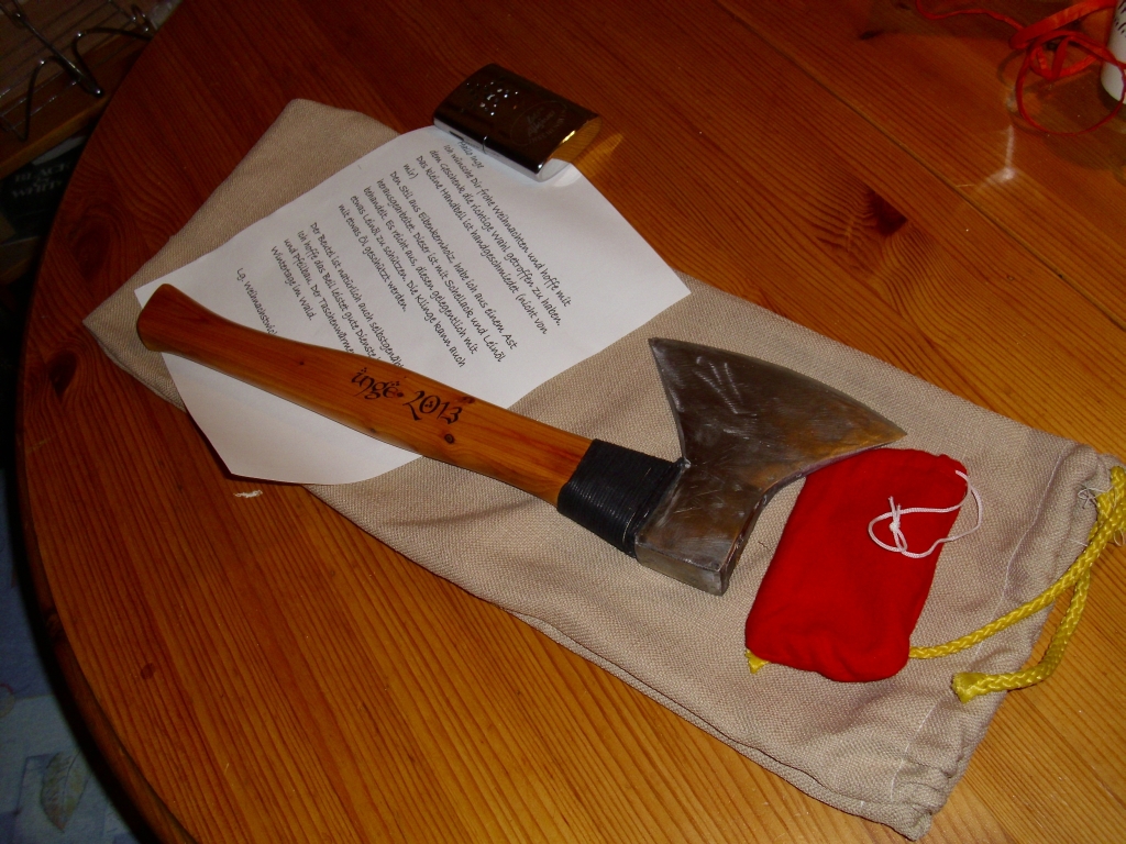 So nun zum Wichtelgeschenk. Ich liebe ja Handwerkszeug und kann mich nun stolze Besitzerin eines handgeschmiedeten Beils nennen. Das hätte ich niemals erwartet und ich freue mich riesig. Der Stiel ist aus Eibenkern und liegt sehr gut in der Hand. Dabei noch ein lieber Brief und für die kalten Tage ein Taschenofen. Fotos Morgen, da ich zu vollgefr...sen bin. Freu mich schon darauf, das Beil auszuprobieren.