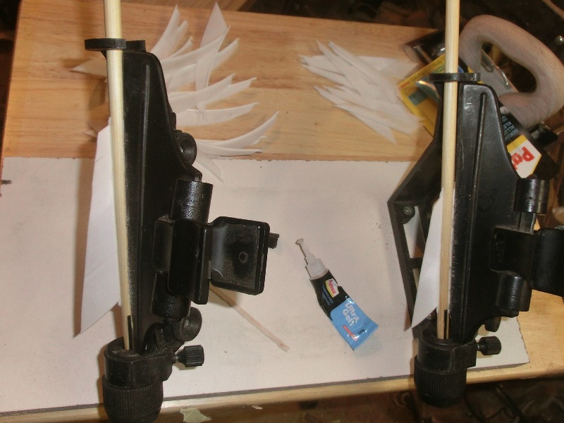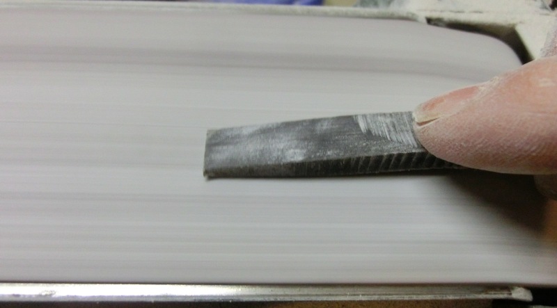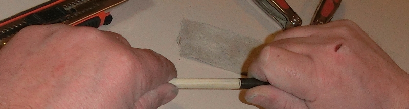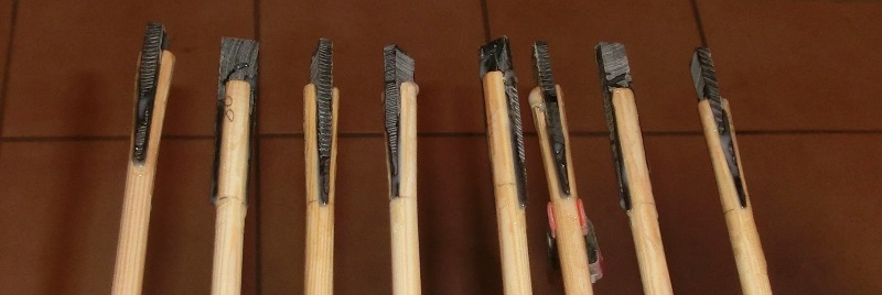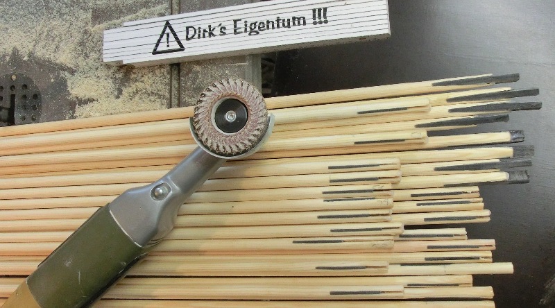 Zuerst einmal die benötigten Schäfte zusammensuchen und sortieren. Wenn man gleich eine größere Menge an Schäften bearbeitet, dann lohnt sich wenigstens der ganze Maschinenpark. Die Schäfte werden nach Spine, Gewicht und Länge zu verschiedene Gruppen zusammen gestellt. Dann wird die Tiefe des Einschnittes am hinteren Ende, und dessen Lage markiert. Die Hornplatten für die Inlays müssen leicht plangeschliffen werden. Dazu klebe ich sie mit doppelseitigem Klebeband auf ein Rum-Fort-Brett und gehe mit dem Bandschleifer einmal drüber, nur soviel das die groben Riefen und Sägespuren beseitigt sind. Danach werden die Hornplatten erst halbiert, und dann noch mal der Länge nach geteilt. Aus dicken Hornplatten werden Keile für Flightpfeile geschliffen. Schon etwas zu spitz um sie bequem im Schaft einzupassen. Die Spitzen werden wieder auf Sägeblattdicke „stumpfgeschliffen“, passend für den Keilausschnitt im Schaft. Die Pfeilschäfte werden mit der Bandsäge geschlitzt. Und mit einer Schlüsselfeile wird der Schlitz an die Horninlays angepasst. Sie werden dann mit einen Epoxid eingeklebt, eine Wäscheklammer kann helfen.