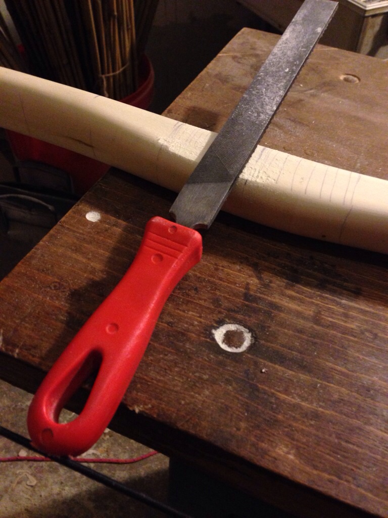 Raspel in die Sehne einnocken und in Pfeilflugrichtung Raspeln. Damit werden die Bauchkanten des Griffes in der Pfeilrichtung angeglichen. Dadurch kann ich im Griffbereich bei minimalem Holzabtrag/Zuggewichtsverlust das Maximum herausholen, damit der Pfeil weniger am Griff anschlagen kann.