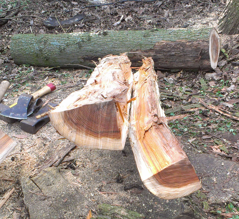 Das Spalten war eine abartige Schinderei! Ich habe zwei Stunden benötigt, um die vier Viertel zu bekommen. Das Zusammenhalten von Querfasern im Spaltriss scheint so ähnlich zu sein, wie bei Ulme.