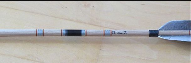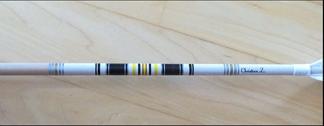 Zeder 5/16, Länge jetzt noch 29" (werden je nach Flugverhalten noch um 1" gekürzt), Gewicht zwischen 403-413 gr, Spine 35#.