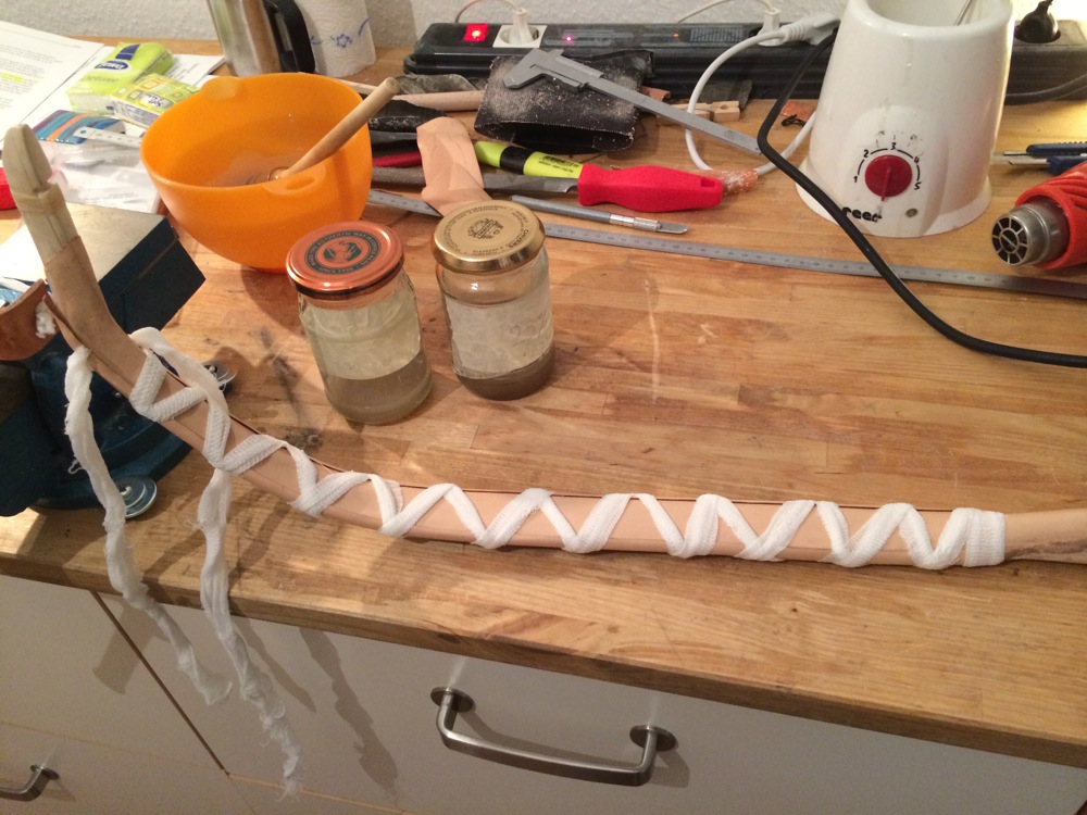 ich bin Euch ein paar Fotos vom Bekleben mit dem Leder schuldig! Lessons learned bei der Aktion: 0,7mm ist selbst nach hobeln und schleifen eigentlich immer noch zu dick. 0,4-0,5mm Ausgangsmaterial wären super. Habe ich aber nicht auftreiben können. Aber wohl ein Vorteil: Dieses Leder gleicht die kleinen Unebenheiten in der Sehnenschicht sehr wohlwollend aus.
