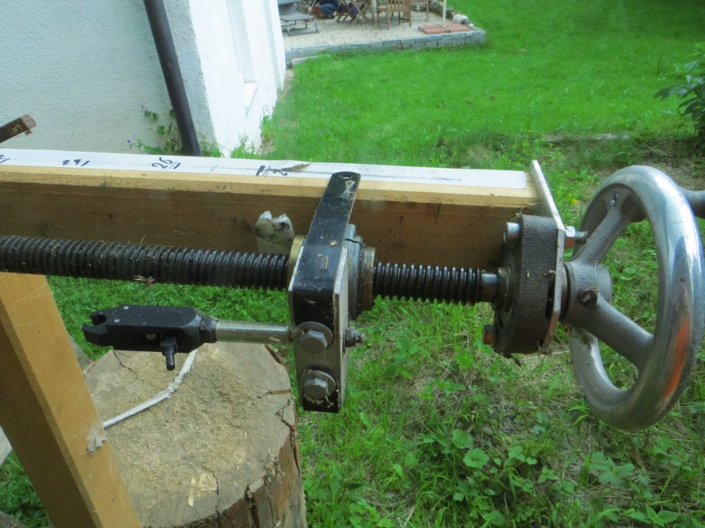 Eigentlich habe ich nur ein paar Vierkanthölzer an einen Hackklotz geschraubt. Die Spindel ist von einer alten Fräsmaschine und ausgelöst wird mit einem Release. So ist zumindest meine Variation des Auszugs ausgeschlossen. Abgesehen davon habe ich Schwierigkeiten, 28" auszuziehen, die Arme sind etwas kurz geraten:-(.
