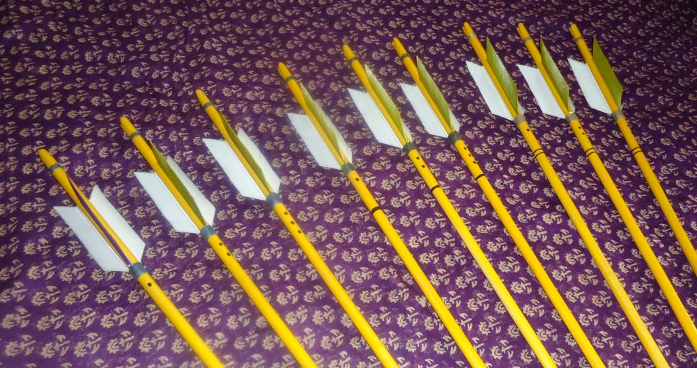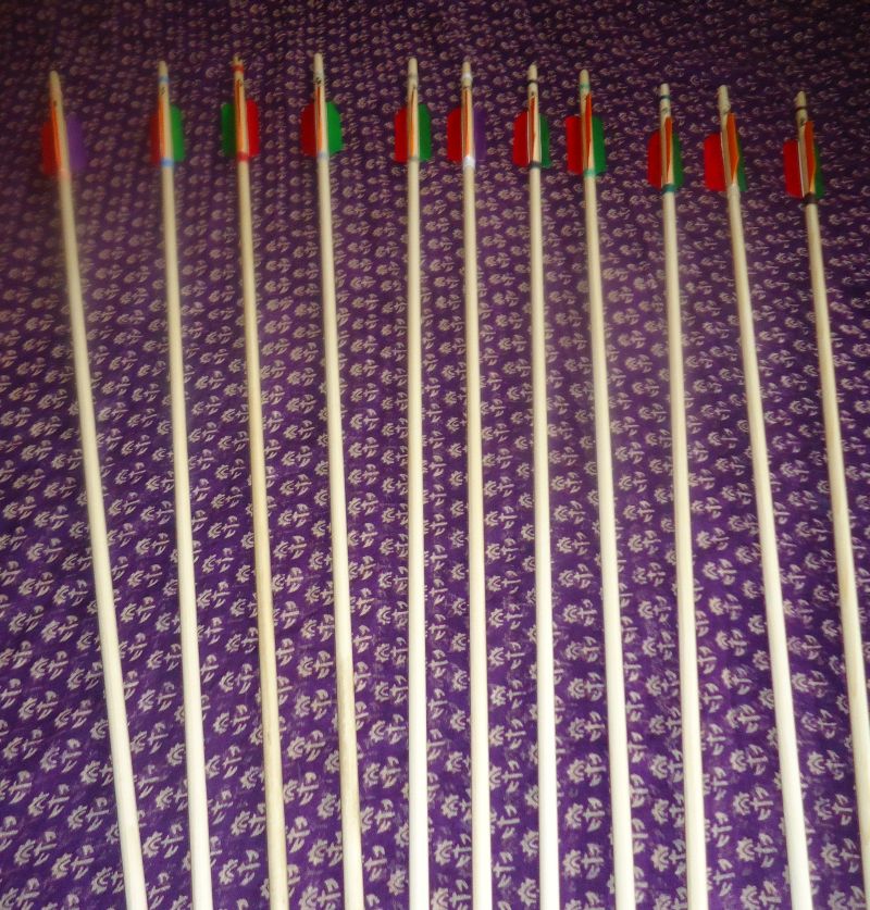 9 Pfeile mit einem Gewicht zwischen 220 und 230 grain mit jeweils einer 30gr. Aluspitze, 32 bis 34 mm Durchbiegung, Länge 26", gekennzeichnet mit Punkten und Kringel (weil wir schießen ja immer brav den gleichen Pfeil als Pfeil 1 aufm Parcours )