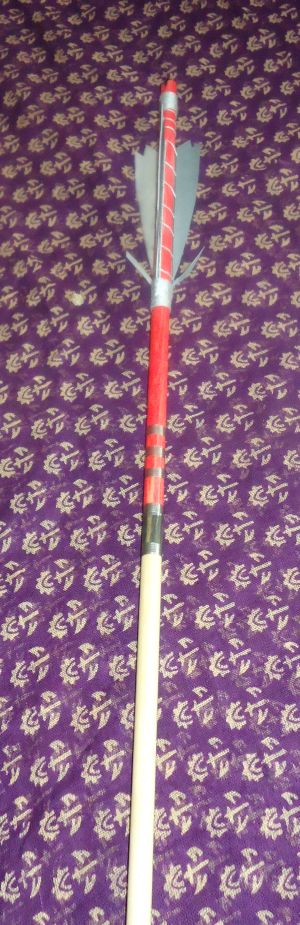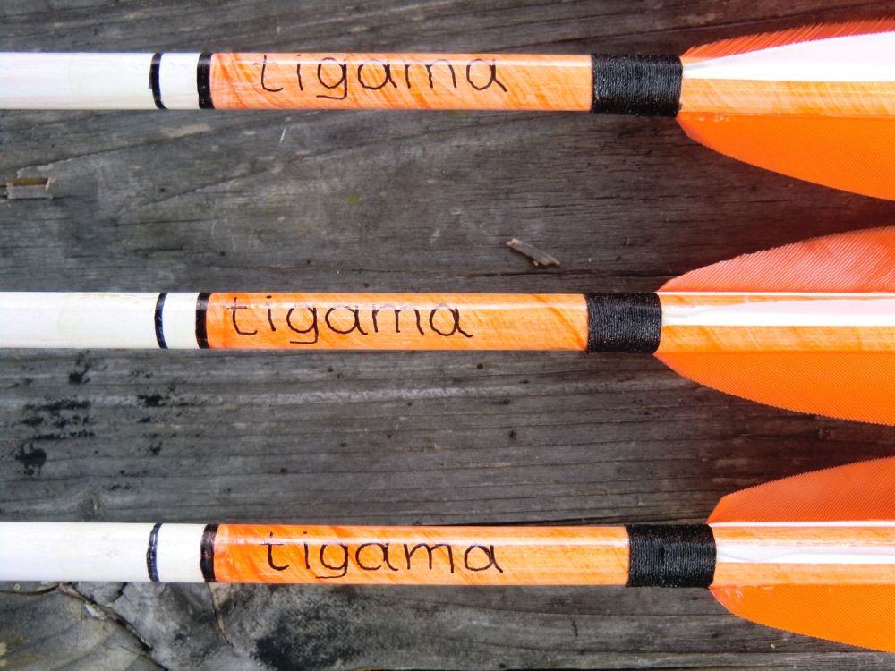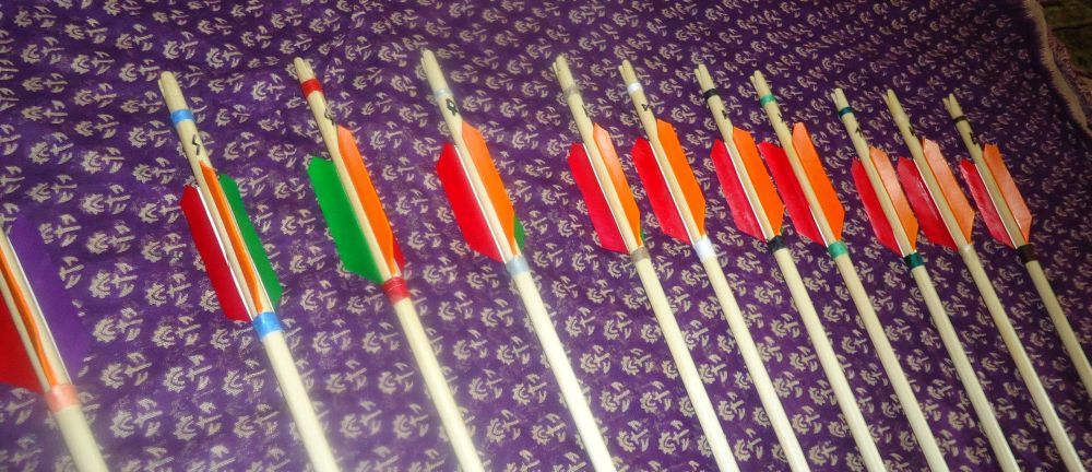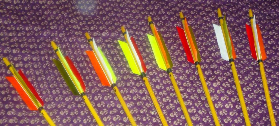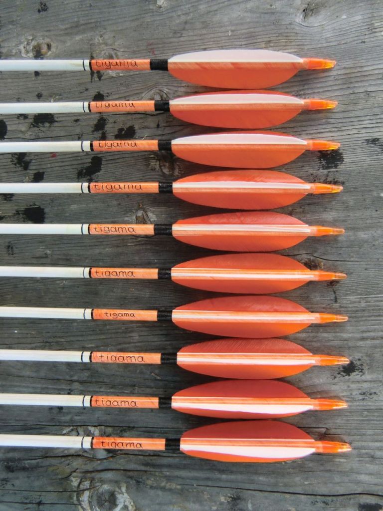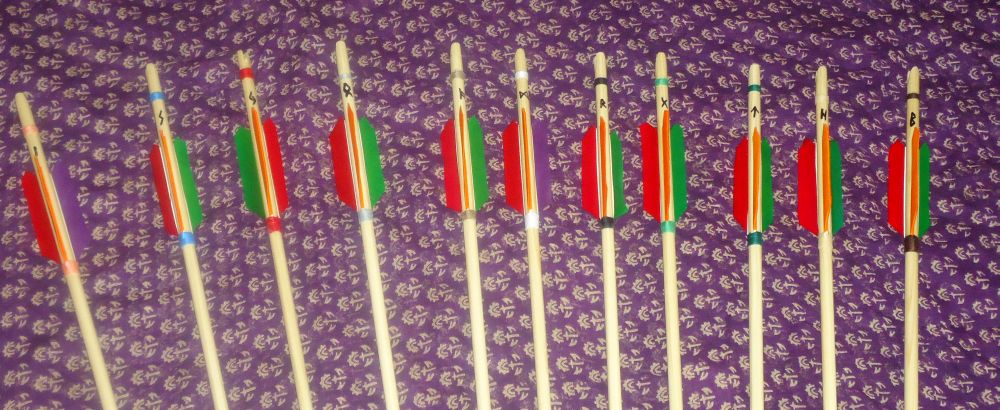 14 Pfeile mit einem Gewicht zwischen 325 und 335 grain mit 70gr. Feldspitzen, 26 bis 28 mm Durchbiegung, Länge 28", zur Identifizierung verschiedenfarbig gewickelt und mit (der Abwechlung halber) Runen bezeichnet.