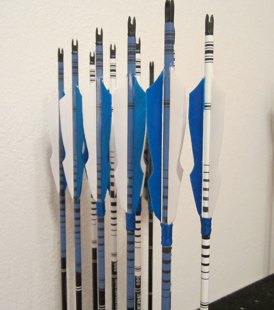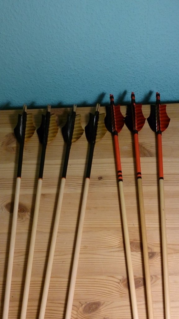 (komisches Wortgefüge) und an den anderen Dingern Spitzen ran zu machen) erst in ein paar Wochen ankommt, habe ich damit angefangen mir mit den Pfeilbau die Zeit zu vertreiben. Da das auch meine ersten Pfeile sind finde ich sie recht gelungen, obwohl ich die Federn bei meinem zweiten Pfeil falsch aufgeklebt habe. Trotzdem bin auch etwas entäuscht, weil ich gehofft habe, dass sie besser werden. Für das Cresten werde ich mir noch was überlegen da die paar Ringe relativ schief geworden sind.
