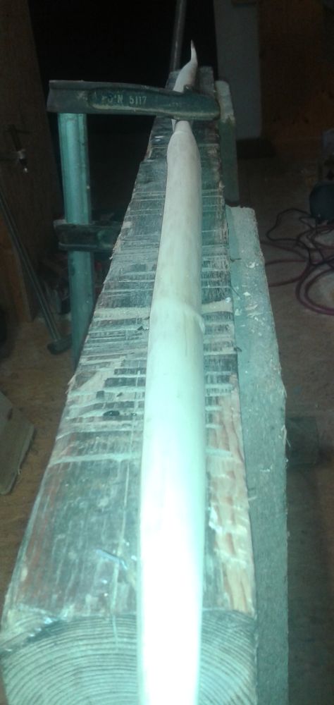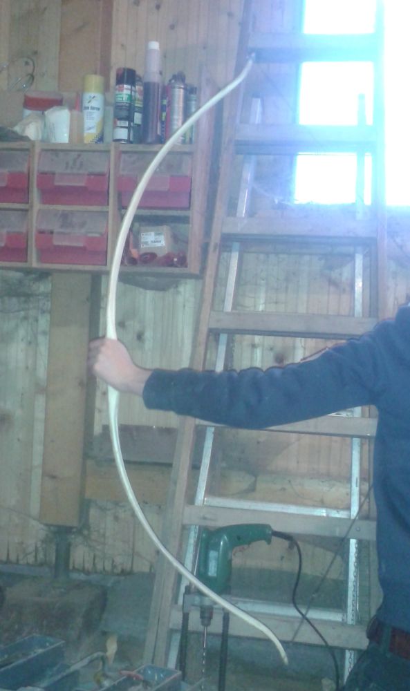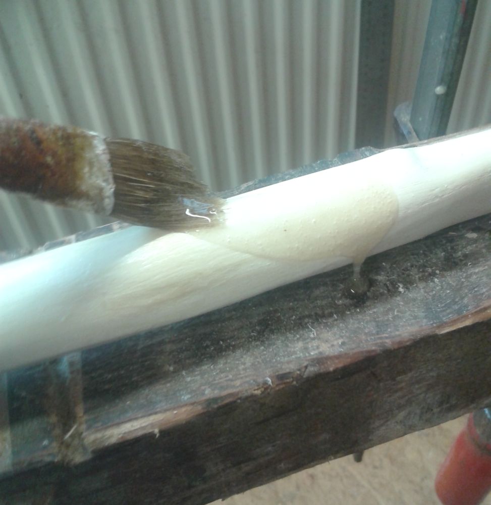 Hautleim im Wasser ziehen lassen.... .....auch die Sehne einweichen.... ...und den Bogenrücken schleifen, entfetten und möglichst nahe am Arbeitsplatz platzierten. Dann den Hautleim erhitzen.... ...Rücken dünn mit Leim grundieren... ......und dann halt die Sehne drauf