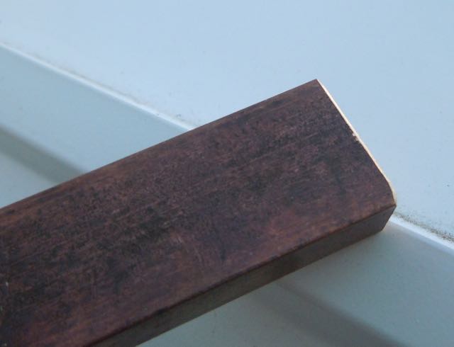 Als Beispiel hier ein Stab aus rötlicher Bronze (Rotguß), gerade im schlechten Abendlicht am Fenster aufgenommen. Bei diesem Stück kommt beides zusammen Oxidschicht und Schmutz und die Schnittfläche ist deutlich heller als der Rest.